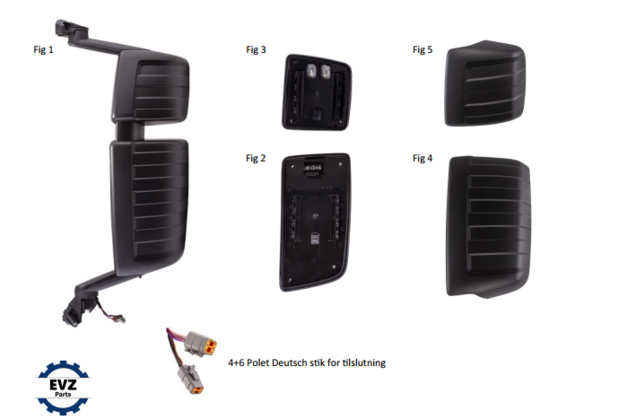 Kpl. Spejlsystem med Vidvinkelspejl El-justerbar sidespejl m/varme R1200 Man-justerbar vidv.spejl m/varme R300 Lang spejlarm |