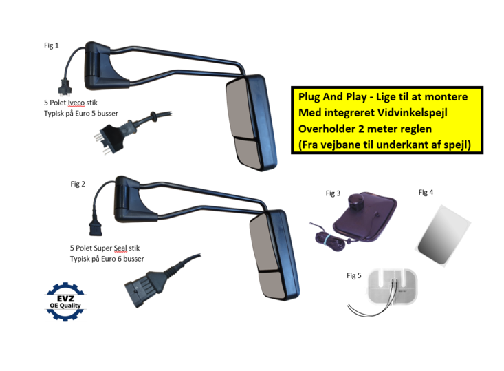 Kpl. Spejlsystem m/varme HØ Elektrisk justerbar sidespejl Manuel justerbar vidvinkelspejl Med 5 polet Super Seal stik |