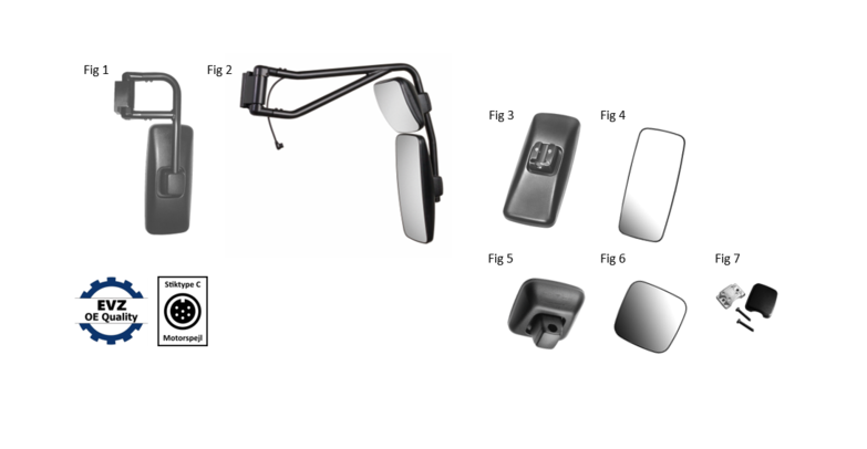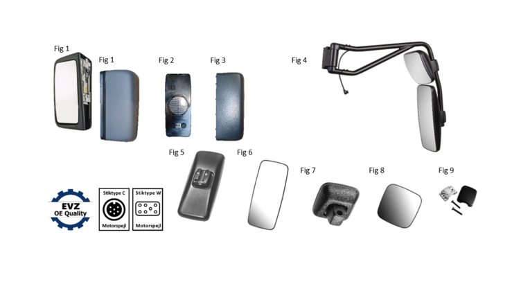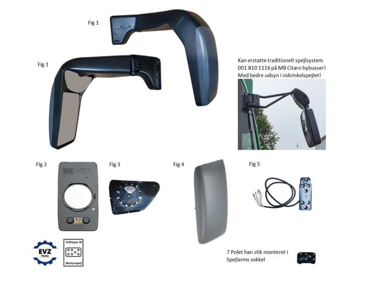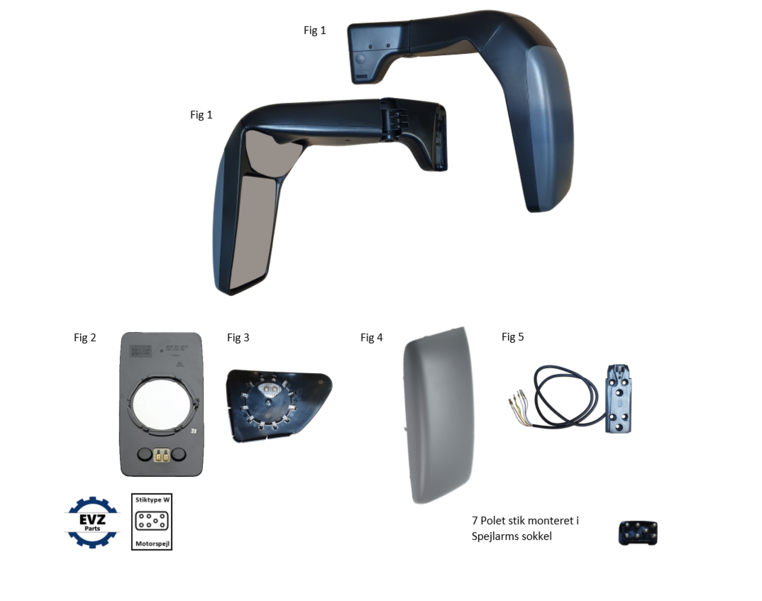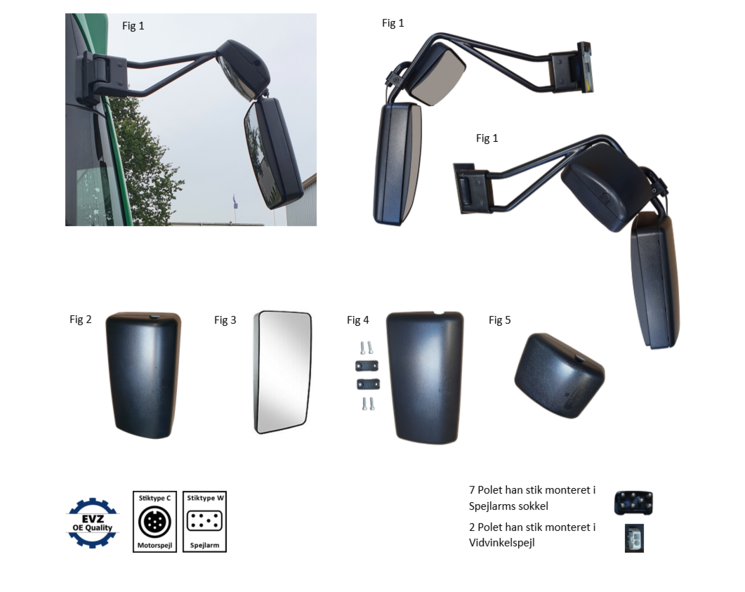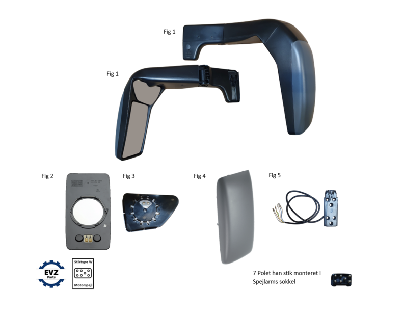Komplet spejlsystem HØ El. just.bart sidespejl m/varme Manuelt vidv.spejl m/varme Leveres uden mont.kile f/chassis |